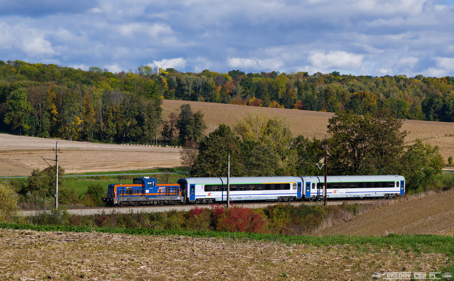 20.10.2025r. Wagony bezpośrednie z Warszawy, czyli IC 60151 Śnieżka z Wrocławia do Kudowy Zdrój na szlaku między Ziębicami i Starczowem. W większości przypadków skład skrócony do standardowych dwóch wagonów byłby powodem do kręcenia nosem, tym razem jednak weszło idealnie :) Traktorek pod górę nawet dawał radę, będąc przy tym zaskakująco cichym.