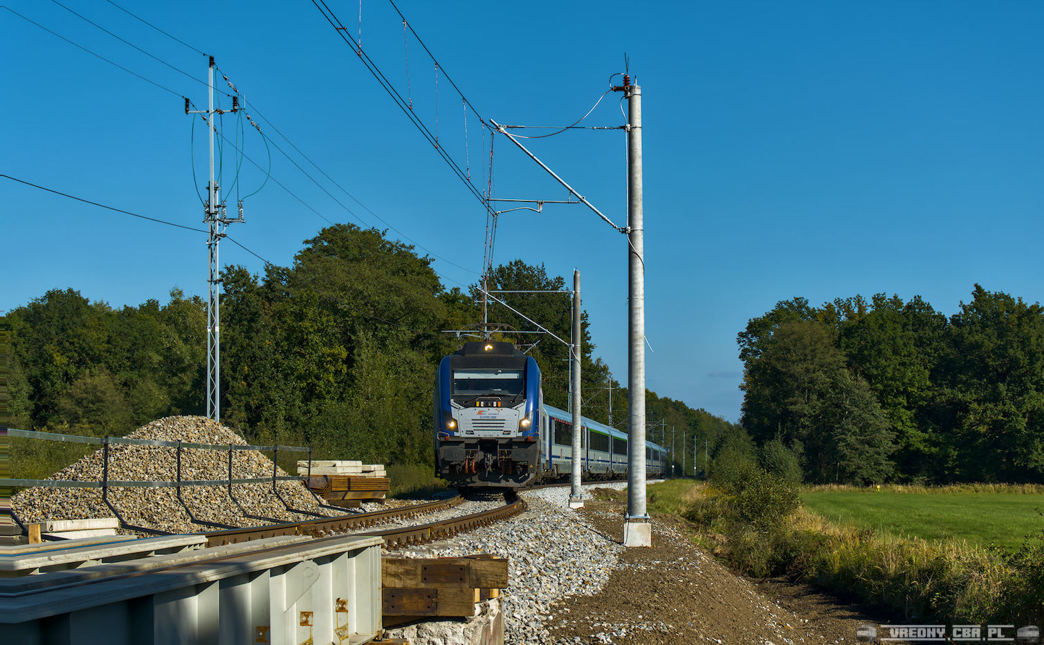 3.10.2025r. Pociąg EIC 1603 Ślęża z Warszawy do Wrocławia zbliża się do tarczy ostrzegawczej posterunku odgałęźnego Bolko. Obecnie toczą się prace modernizacyjne na LK144 i 61 między Opolem i Częstochową. W ich efekcie, poniesiona zostanie prędkość - odcninkowo do 160 km/h. W połączeniu z podobnym zadaniem na wiedence pozwoli to skrócić czas jazdy między stolicami Mazowsza i Dolnego Śląska o kolejne bezcenne minuty. W ramach prac, między innymi, zbudowane od nowa zostaną trzy mosty - dwa w Chrząstowicach i ten ze zdjęcia w Opolu nad Maliną. Linia była przygotowywana do budowy drugiego toru przez niemieckiego okupanta w czasie drugiej wojny światowej, co teraz pozwoliło w łatwy sposób stworzyć bajpasy wykorzystując poszerzone przyczółki. Stary obiekt już nie istnieje, ruch prowadzony jest mostem tymczasowym. Dzięki temu czas zamknięć torowych udało się zminimalizować.